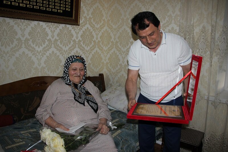 Пахрутдин Залибеков отметил, что район гордится ею и вручил ей памятные подарки, поздравительное письмо и денежное вознаграждение. «Мы пришли поздравить с Вашим столетним юбилеем и решили вручить сто тысяч рублей, которые мы собрали всем миром. Желаю крепкого здоровья, тепла и заботы родных и близких», - сказал Залибеков.